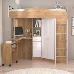 В комплект входит: кровать, внизу которой расположены вместительный угловой шкаф (полки и штанга), стеллаж для книг и компьютерный стол с дополнительным столиком.